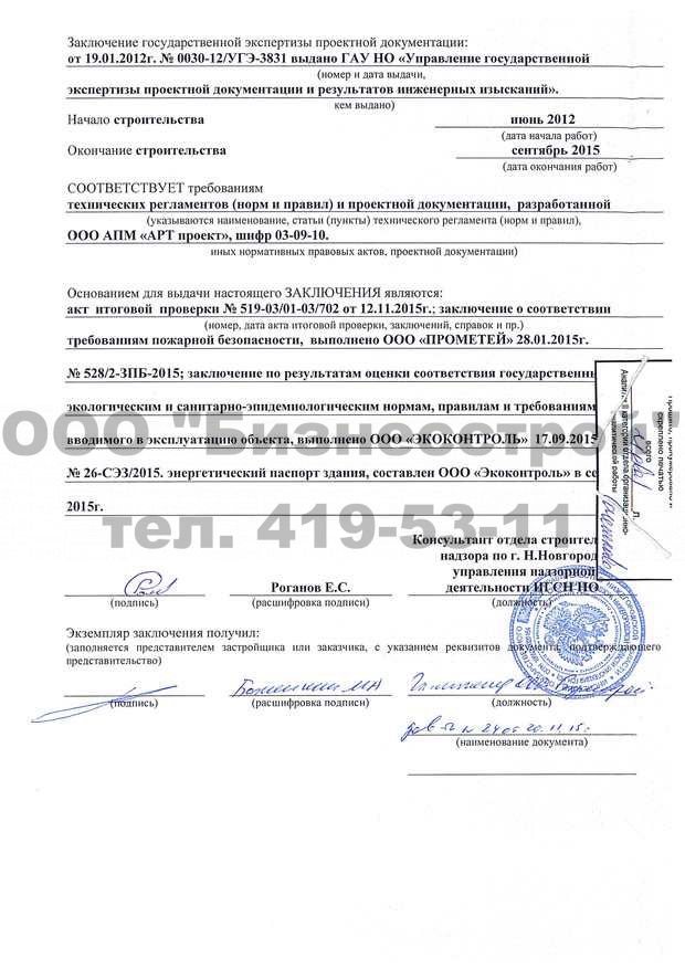 - заключение органа государственного строительного надзора (в случае, если предусмотрено осуществление государственного строительного надзора) о соответствии построенного, реконструированного объекта капитального строительства требованиям технических регламентов и проектной документации, в том числе требованиям энергетической эффективности и требованиям оснащенности объекта капитального строительства приборами учета используемых энергетических ресурсов, заключение федерального государственного экологического надзора в случаях, предусмотренных частью 7 статьи 54 Градостроительного кодекса;
