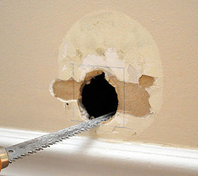 Чтобы спрятать шнуры, все, что вам нужно сделать, это вырезать два отверстия в гипсокартоне и бросить их через стену.Это действительно просто, как пирог.